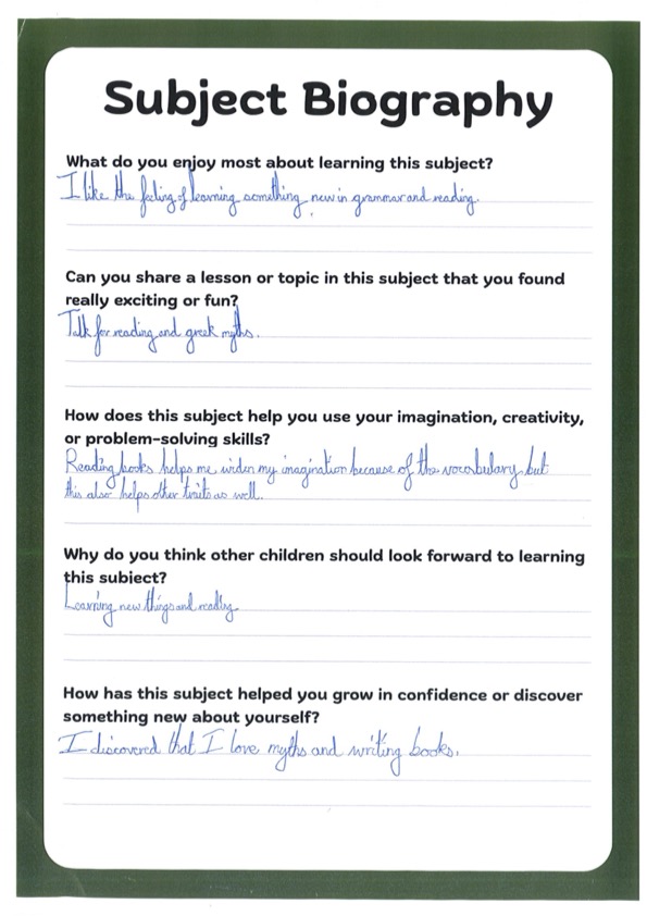 Our approach is designed to ensure progress for every child, encouraging them to develop a positive growth mindset, perseverance, and resilience. Through reading in particular, pupils are given a chance to develop culturally, emotionally, intellectually, socially, and spiritually. We celebrate children’s hard work and effort, alongside their successes. They are encouraged to revisit their work, make changes, and develop their ideas to ensure they achieve their best. Built on the belief that language should be explored and enjoyed—not just learned—our whole-school approach to English places reading for pleasure at its core, with grammar skills seamlessly woven throughout.
