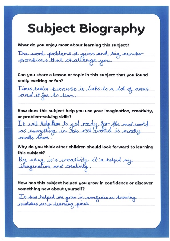 The subject leader is responsible for monitoring the quality of education in maths. This is achieved through lesson observations, pupil discussions, book looks and CPD. Data is analysed at the end of each academic term and a subject report is written at the end of the academic year. All these things inform the next year’s action planning.Maths Ambassadors